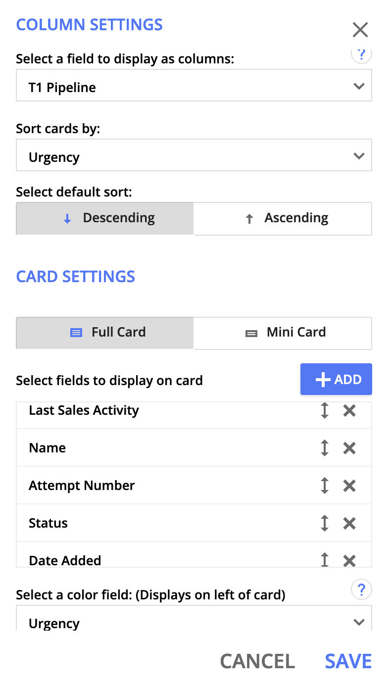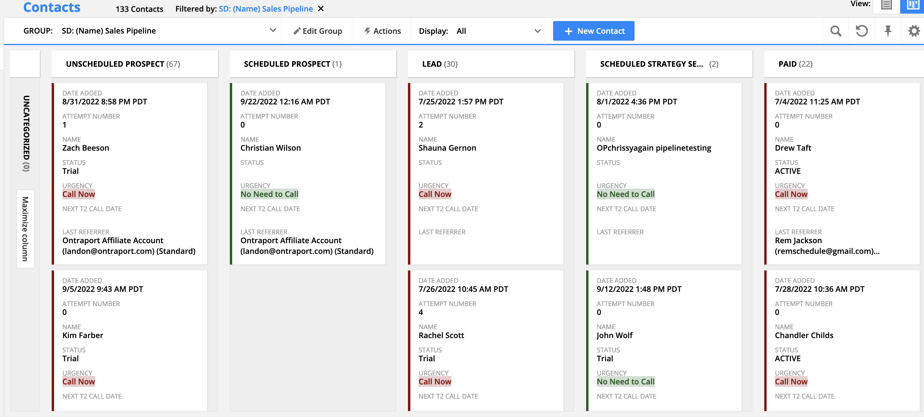 Uncategorized: Repped contacts who need to be placed into one of the following T1 statuses.Unscheduled Prospects: Contacts that have not scheduled a Discovery Call.Scheduled Prospects: Contacts that have scheduled a Discovery Call. Leads: Contacts have attended a Discovery Call and are SQL Yes. They now need to be scheduled on a Strategy Call.Send To VIP: VIP Lead. Send to VIP Services.Scheduled Strategy Session: Leads that are scheduled for a T2 Strategy Session. No follow up needed. Paid: Contacts who have upgraded to a paid account. Schedule a Strategy Session or Discovery Session if they have not yet had one. Upsell for "Done With You" and Dynamic CMS. 90 Days: Reach out to any leads you were in touch with after they paid for 90-days and check in. Upsell for "Done-With-You" and Dynamic CMS. Not a Fit: Marked as SQL No. No follow up needed. Signed up with Another Email: Contacts in pipeline who have an account under a different email address. Lost: Contacts who have cancelled, are not interested, or are inactive over 120 days.In your pipeline, you will use the "urgency" color field to display on the left of each contact in card view. Their urgency will indicate who needs to be followed up with and in what order.